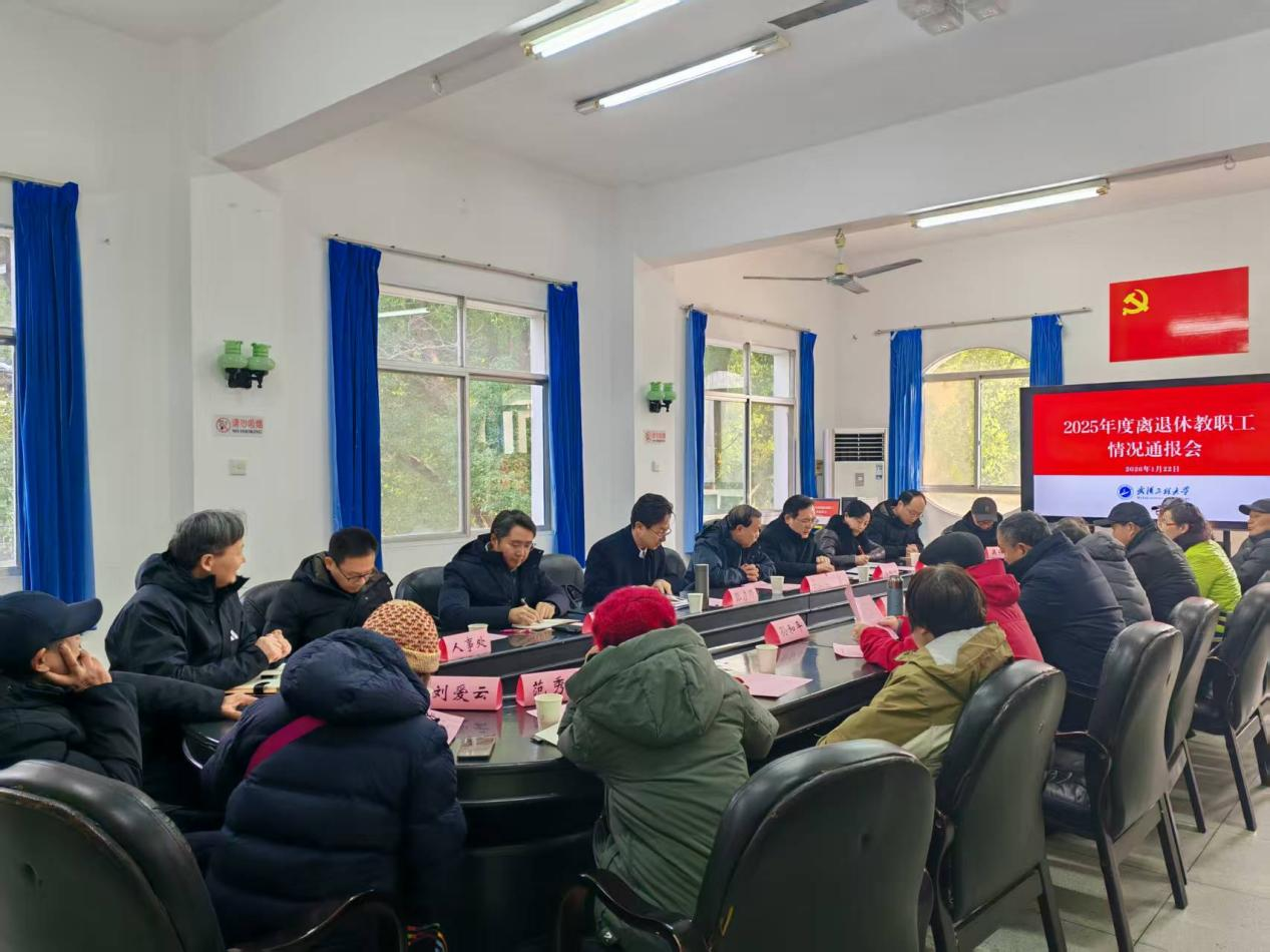 (通讯员:梁艳)1月22日下午,我校2025年度离退休教职工情况通报会在武昌校区离退休教职工活动中心二楼多功能室召开。校党委副书记、校长张彦铎出席会议并讲话,校党委副书记李志旭主持会议。党政办公室、组织部、人事处、保卫处、后勤保障处、离退休干部工作处等职能部门负责人以及离退休教职工党委委员、支部书记、两协理事代表等20余人参加会议。