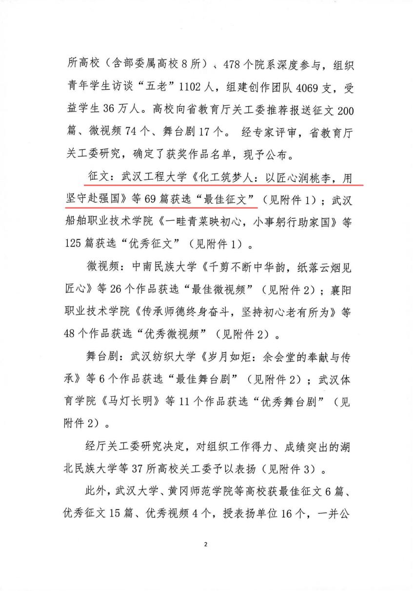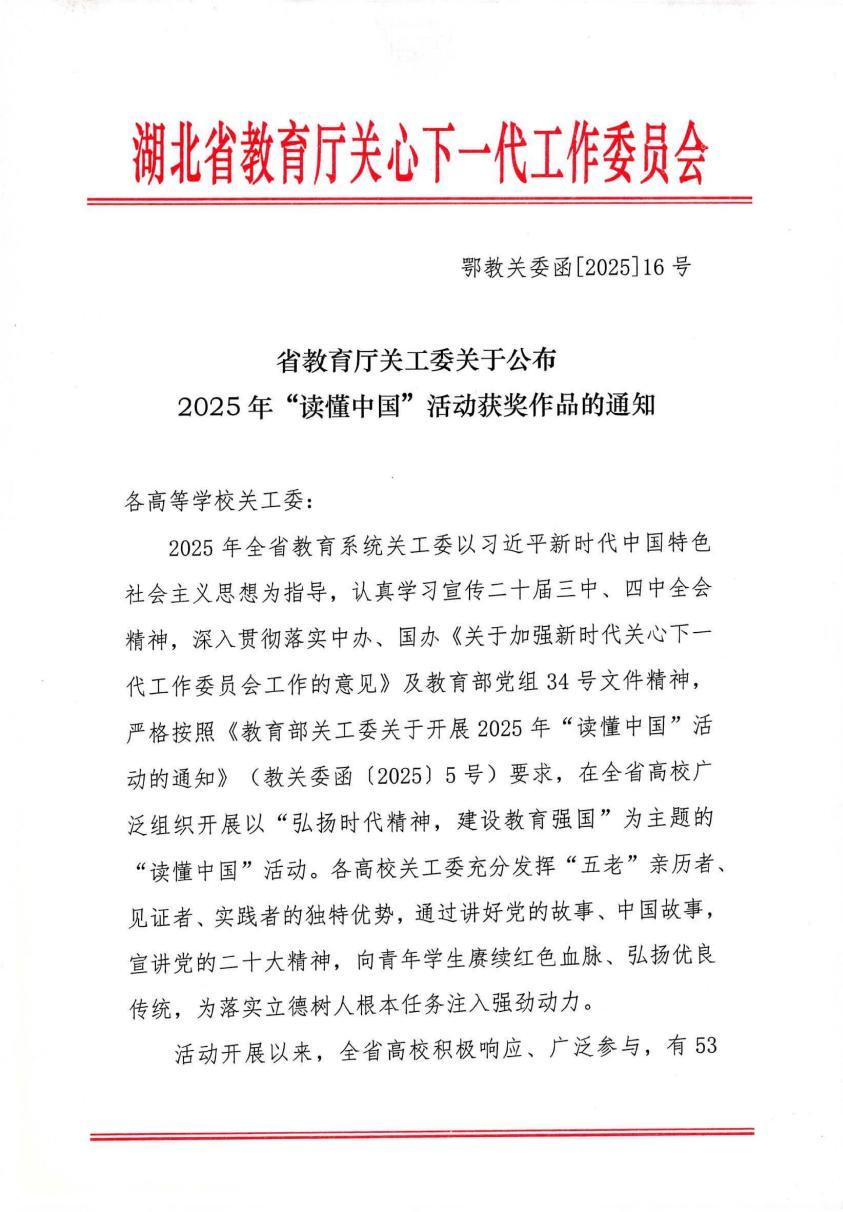 (通讯员:尹俊娥)近日,湖北省教育厅关心下一代工作委员会公布了2025年“读懂中国”活动获奖评选结果。学校关工委凭借扎实的工作基础与丰硕的活动成果,获评“读懂中国”活动表扬单位。我校选送的5篇征文、1部微视频全部斩获奖项,以优异成绩彰显了学校立德树人的育人成效与思政教育工作的扎实成果。